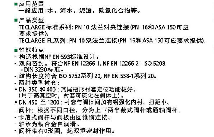 TECFLY進(jìn)口VP3449蝶閥系列: 對(duì)夾連接,閥體材質(zhì):灰鐵,球鐵,鋼,不銹鋼 蝶板:球鐵或316不銹鋼 適用于:水,海水,空氣,碳?xì)浠衔?,?壓力:PN10,PN16 口徑:DN40-DN300 VP3449 TECFLY 閥體:鑄鐵 閥板:不銹鋼316 襯套:EPDM、高溫乙丙膠、丁腈 連接:PN10-PN16-ASA 150 額定壓力:PMS 16 bar 介質(zhì):水,海水,空氣,碳?xì)浠衔?,?TECFLY:通孔形式用螺絲安裝